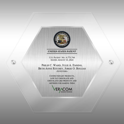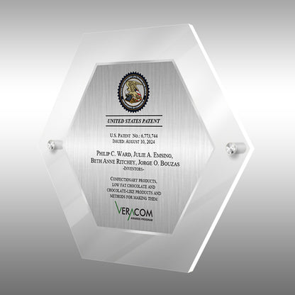 This unique, modern hexagon-shaped Lucite award in a striking jade color features a brushed silver metal plate showcasing the patent granted to you by the US Patent Office, along with recognition from VeraCom.