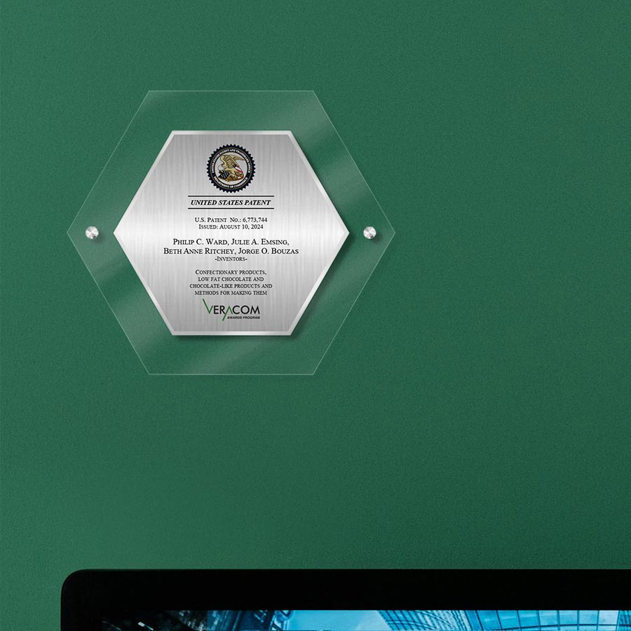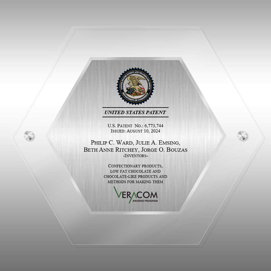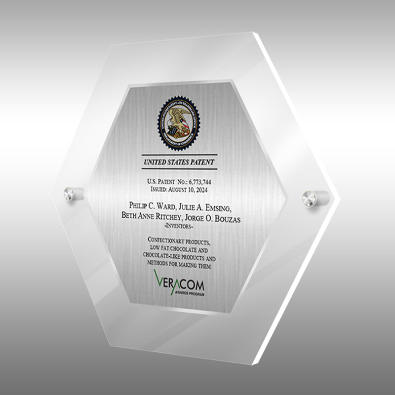 This unique, modern hexagon-shaped Lucite award in a striking jade color features a brushed silver metal plate showcasing the patent granted to you by the US Patent Office, along with recognition from VeraCom.
